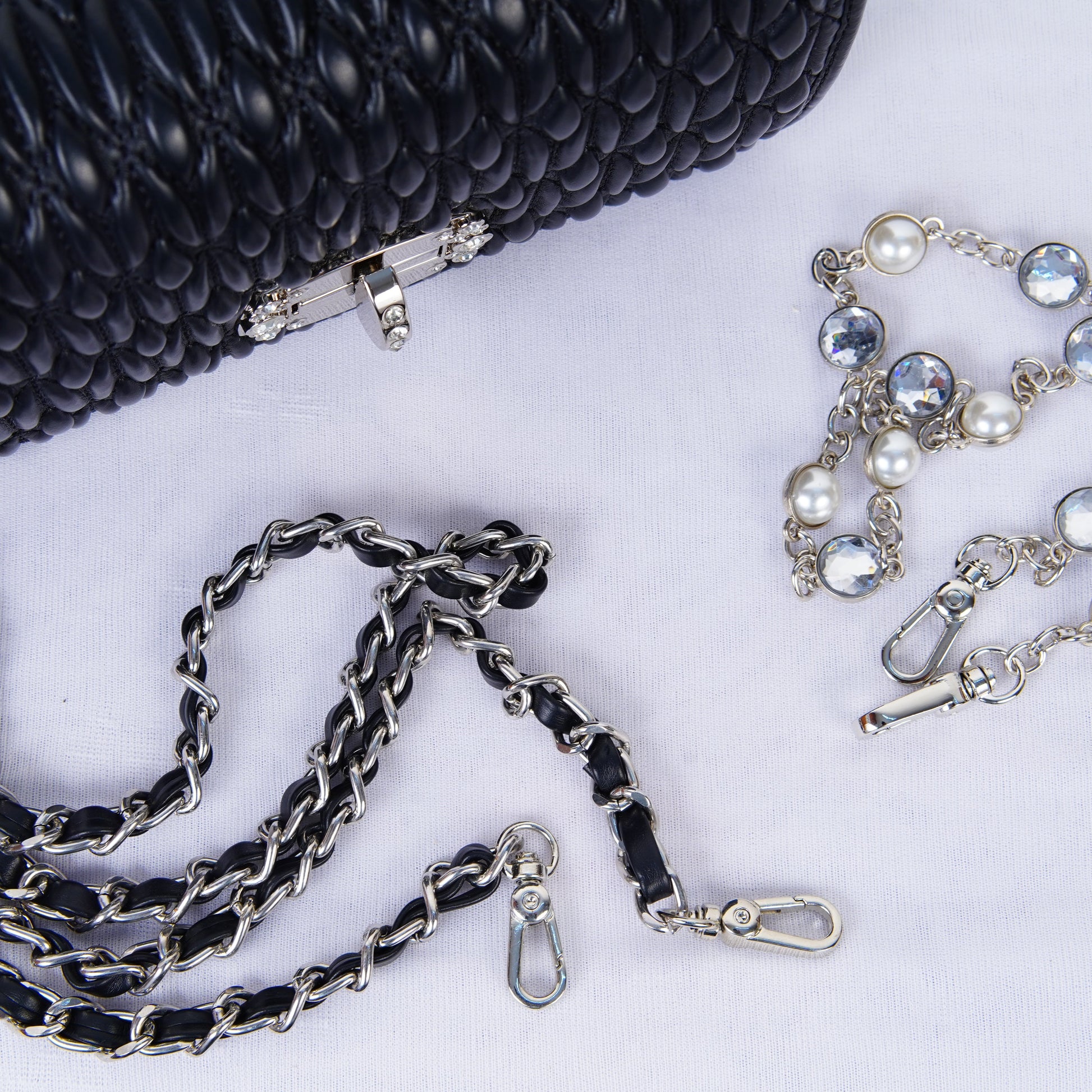 With a detachable silver chain interwoven with leather, it gracefully moves from a clutch in hand to a sling on the shoulder, ready to follow her into candlelit dinners, rooftop soirées, or gala nights.