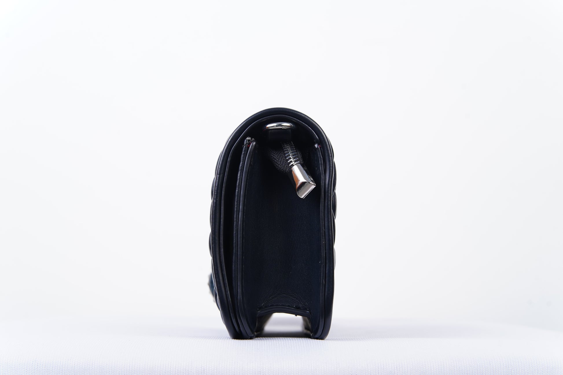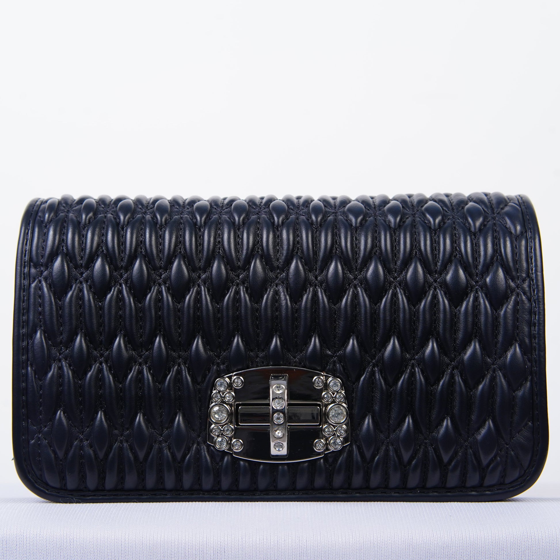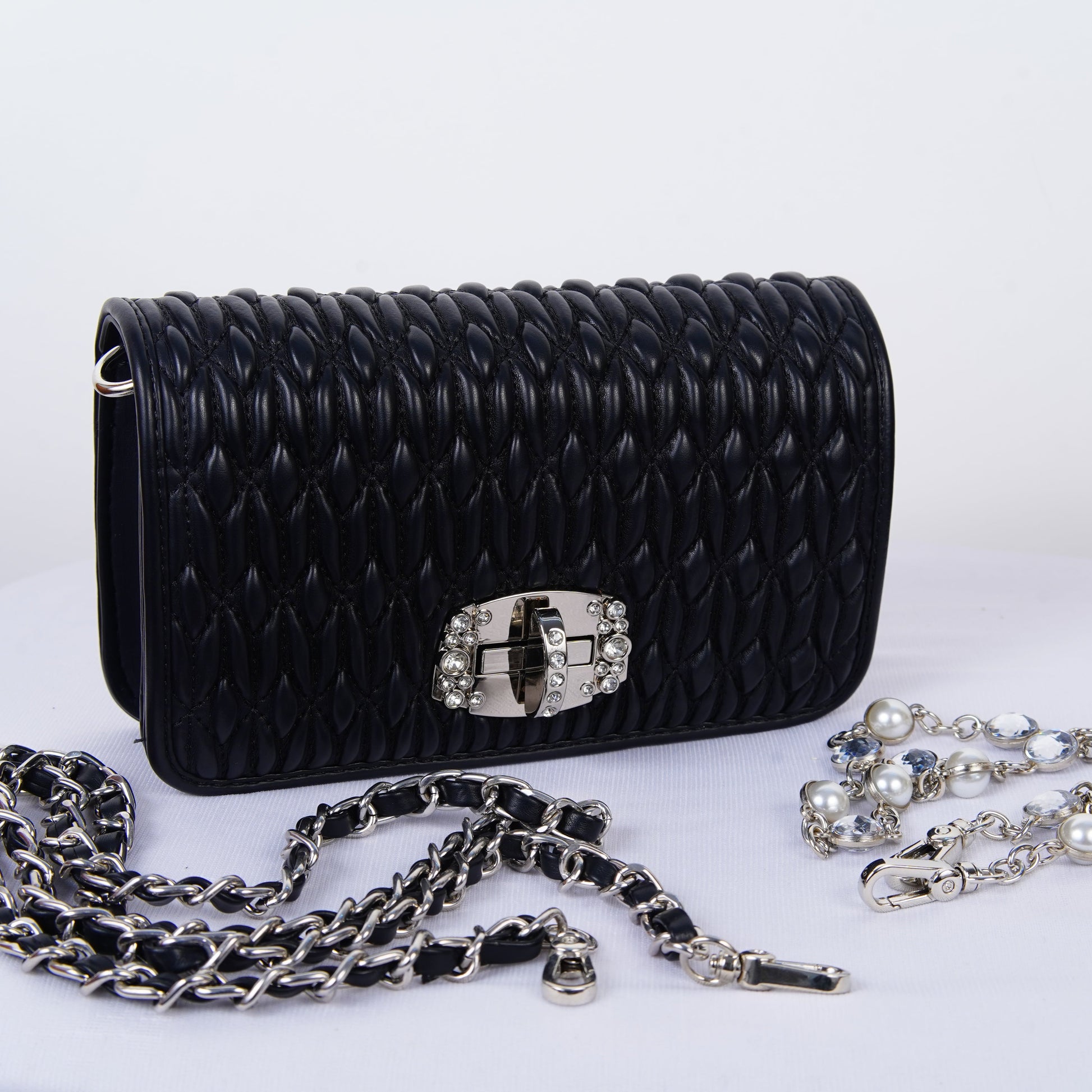 The VANTINA Crystal Noir Sling is a love letter to timeless glamour. Dressed in deep, midnight-black quilted leather, the texture alone tells a story of luxury. But it’s the jewel-encrusted clasp — shimmering like a constellation — that transforms this piece into wearable art.