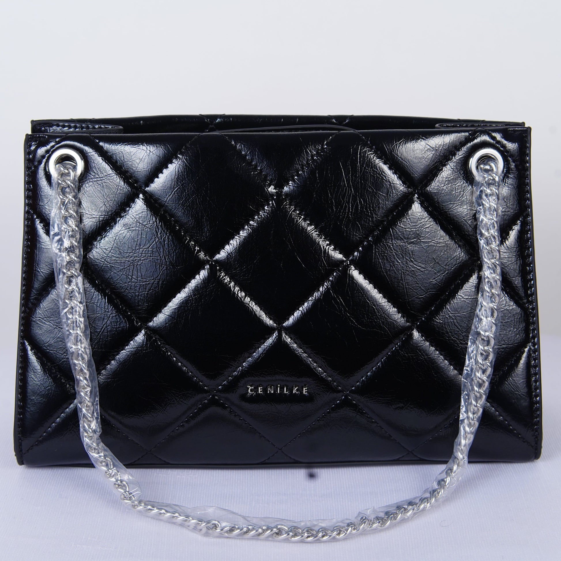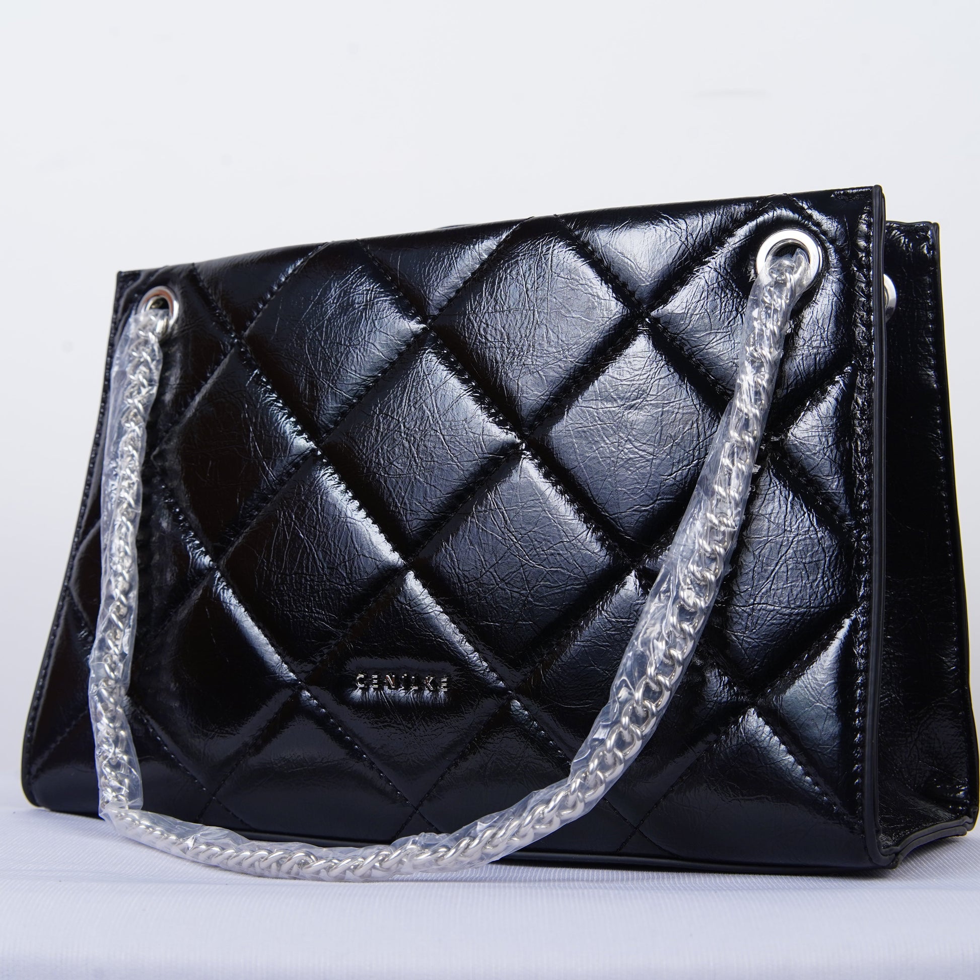 Introducing the ZENILKE Luxe Chain Tote, where timeless charm meets modern flair. Draped in glossy black quilted leather, this tote radiates sophistication with every reflection. The diamond-stitched pattern speaks of luxury, while the transparent chain strap adds a futuristic twist to a classic silhouette.