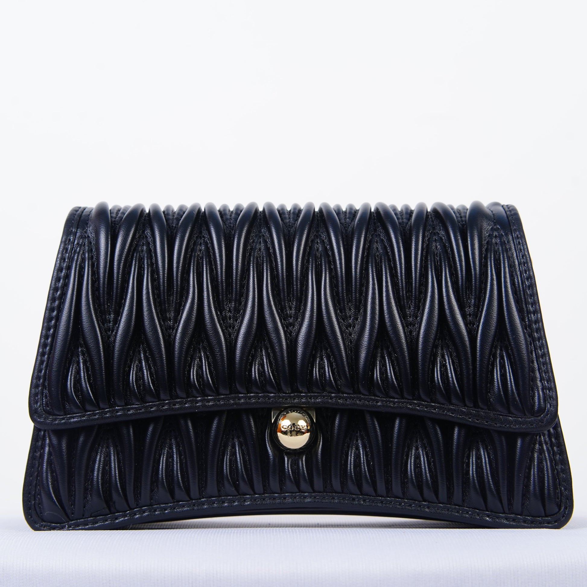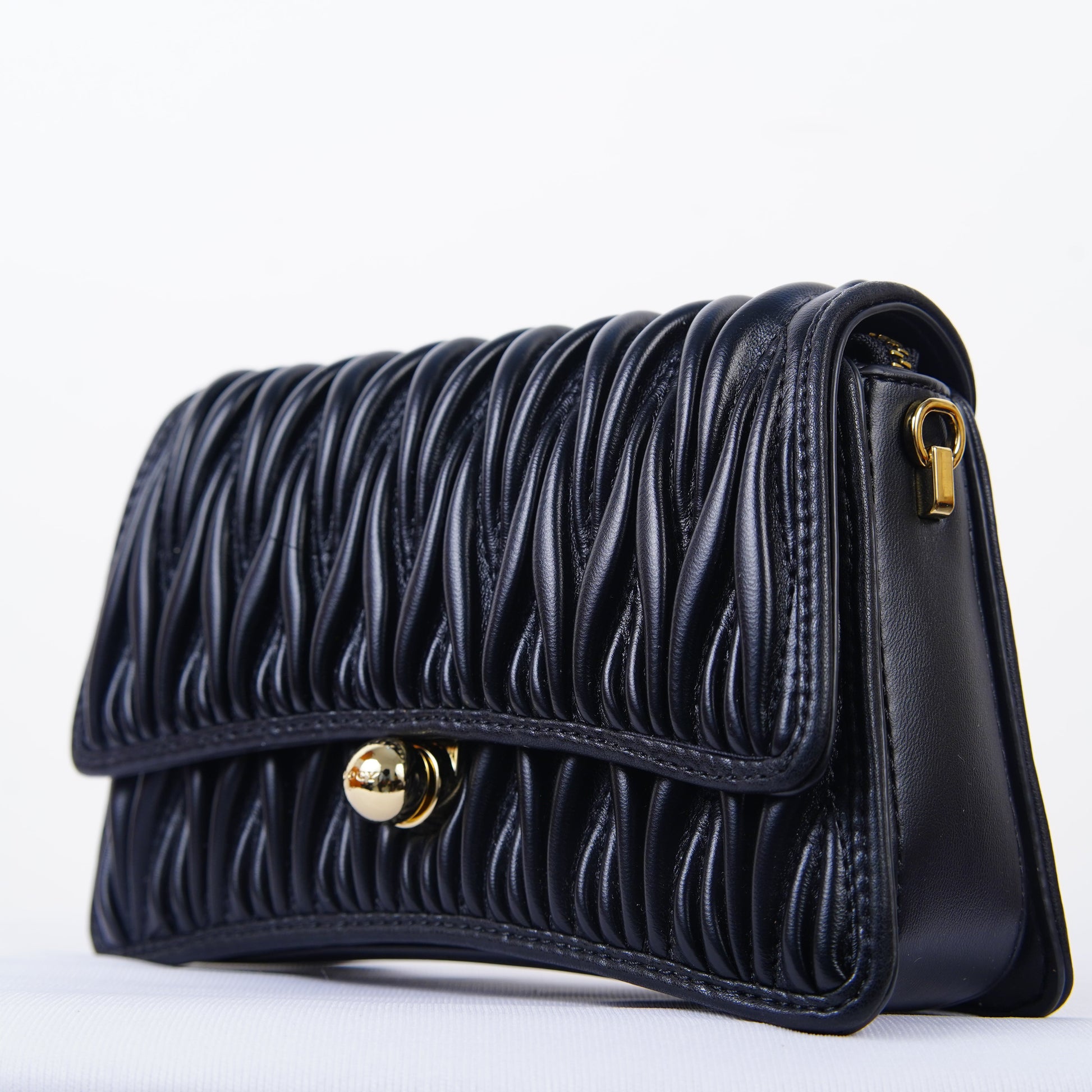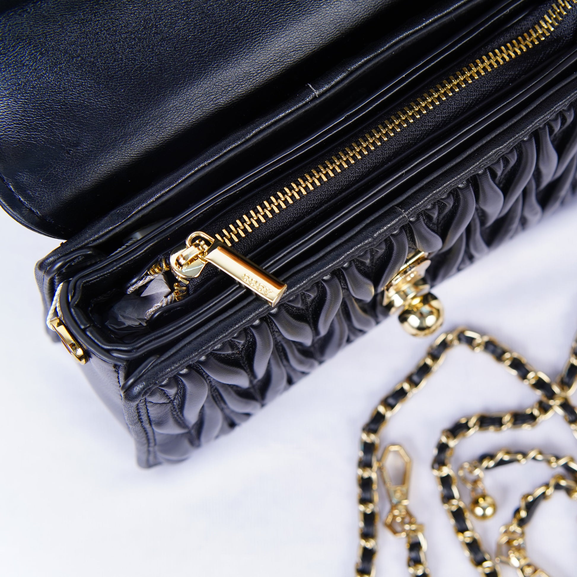 Crafted for evenings that deserve to be remembered, the VANTINA Noir Weave Clutch is a statement in sculpted elegance. Its deep black tone and intricate wave-textured leather catch the light with every move, like shadows dancing under moonlight.