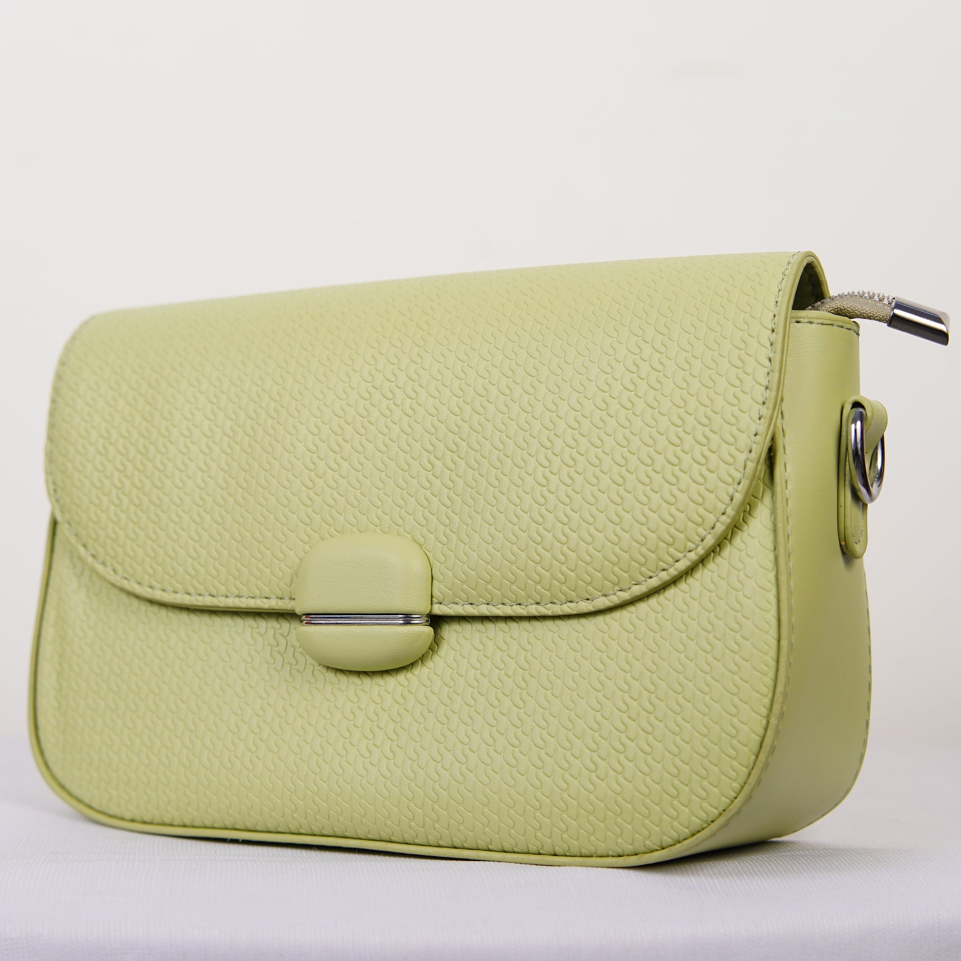 Crafted in a soothing sage tone and kissed with a textured pattern that played in the light, this bag wasn’t just an accessory—it was her quiet confidence stitched in style. The secure clasp snapped shut like a secret, keeping her essentials safe and her look seamless. Whether slung over the shoulder or crossbody with its bold zig-zag strap, it moved with her—light, purposeful, unapologetically chic.