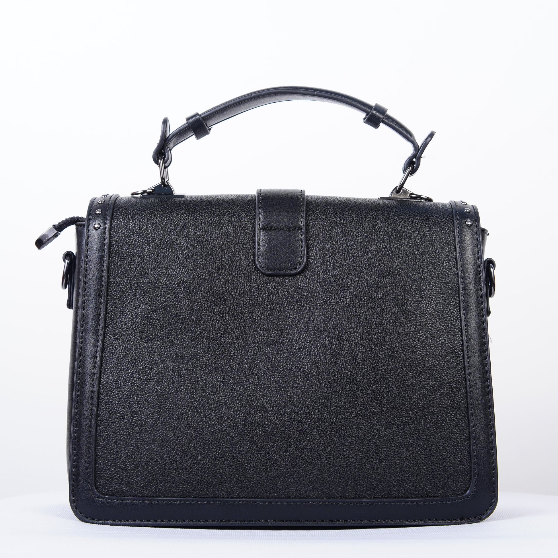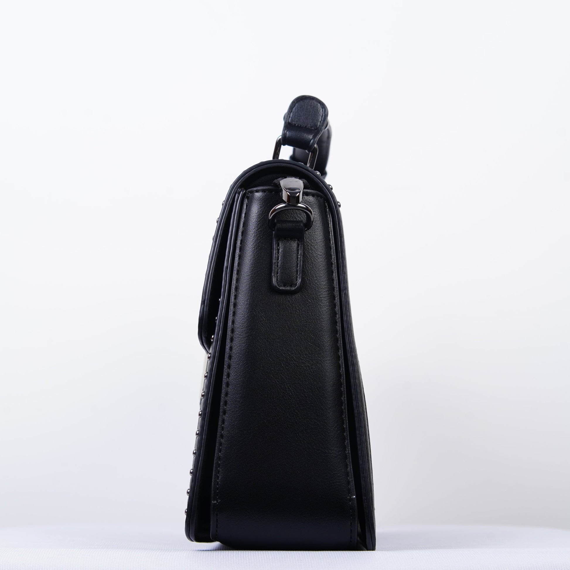 The VANTINA Studded Grace Satchel is built for the modern woman who embraces power and polish in equal measure. Wrapped in sleek black textured leather, the bag balances classic form with contemporary edge — from the bold monochrome clasp to the precise line of metallic studs that trace its silhouette like armor.