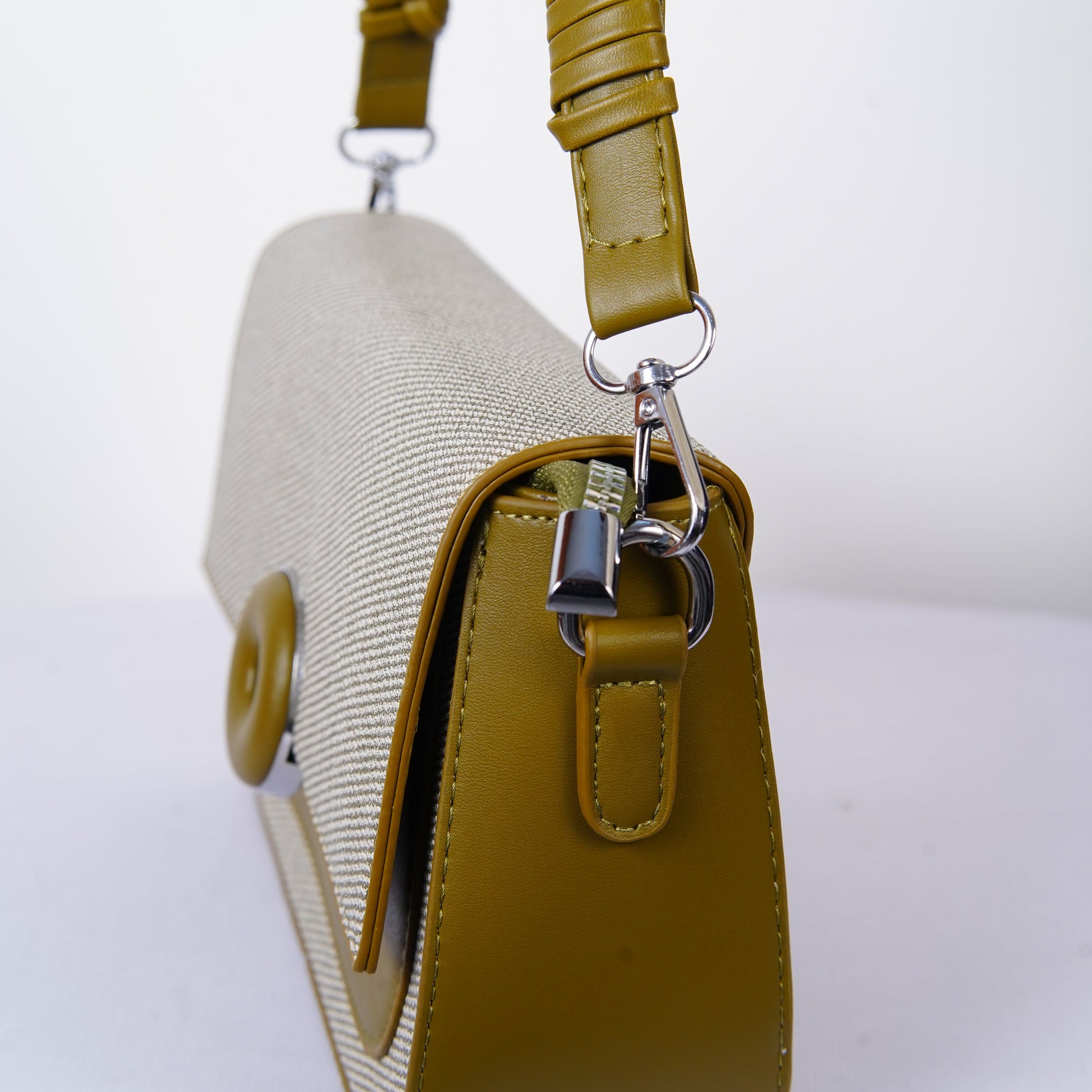 Designed with a modern mix of khaki-toned canvas and olive green vegan leather, this bag captures the charm of urban minimalism. The signature round donut clasp on the front isn’t just playful—it’s iconic. A piece of visual poetry that makes your look instantly unforgettable.